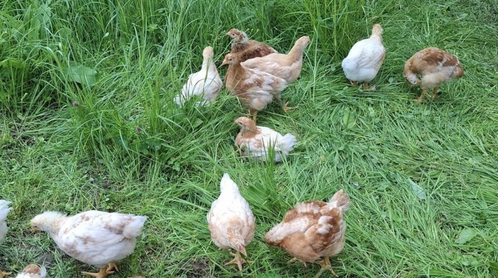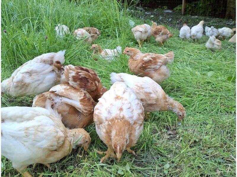 Unsere Bio-Masthühner bekommen wir als Tagesküken. Die ersten 20 Tage werden sie im Stall bei idealer Temperatur aufgezogen. Danach ziehen sie in unseren Mobilstall auf die Wiese und haben dort reichlich Auslauf mit viel frischem Gras.